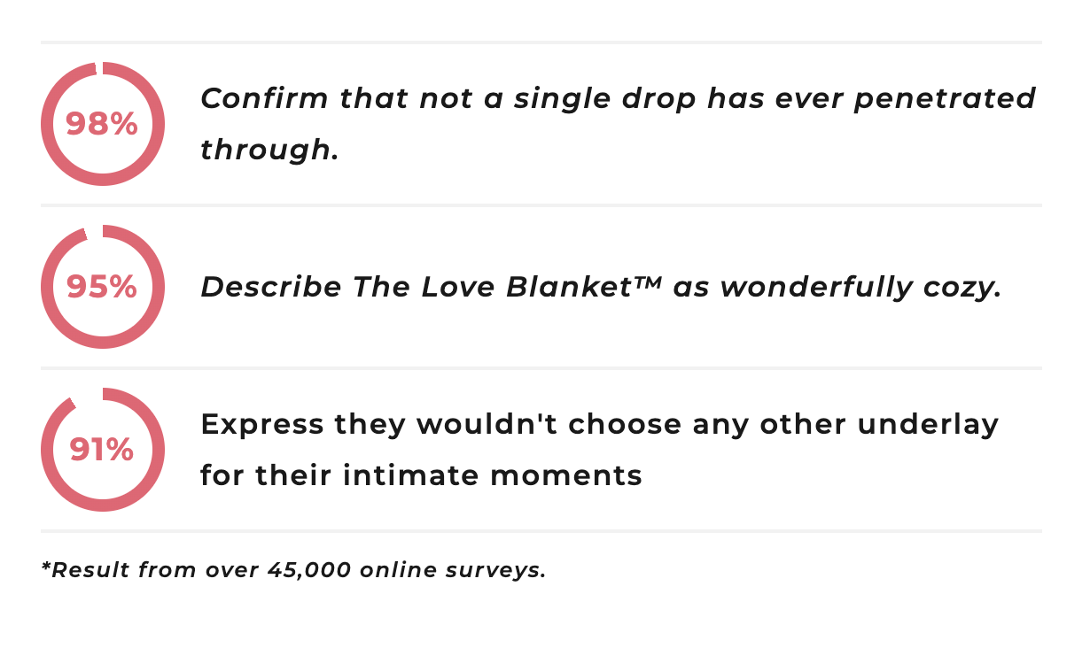 Our Leak-Proof Romance Guarantee means your Love Blanket™ stays 100% waterproof — no wet spots, no ruined sheets. If it ever leaks, we’ll replace it or refund you.